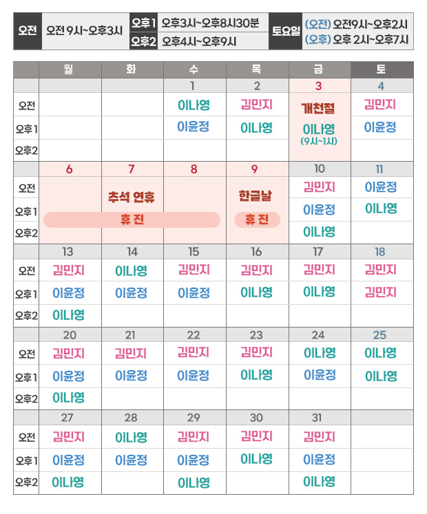평 일 : 오전10시~오후9시 토요일 : 오전10시~오후6시 일요일 : 휴진 공휴일 : 오전9시~오후1시