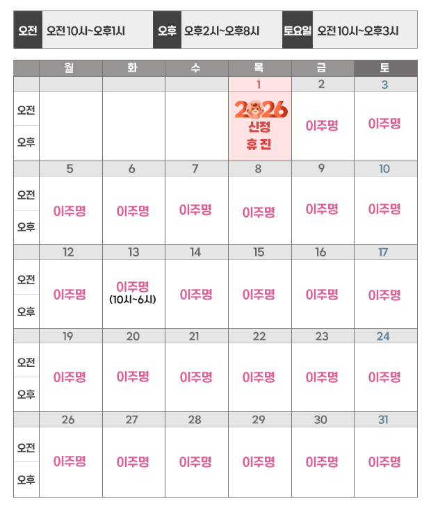 평 일 : 오전10시~오후7시 토요일 : 오전10시~오후5시 목요일/일요일 : 휴진 점심: 오후1:30~오후2:30 공휴일 : 오전9시~오후1시