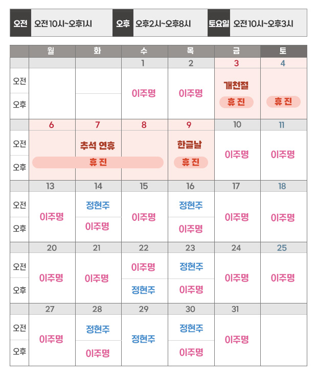 월/화/금 : 오전10시~오후8시 수/목 : 오전10시~오후5시 토요일 : 오전10시~오후5시 일요일 : 휴진 공휴일 : 오전9시~오후1시