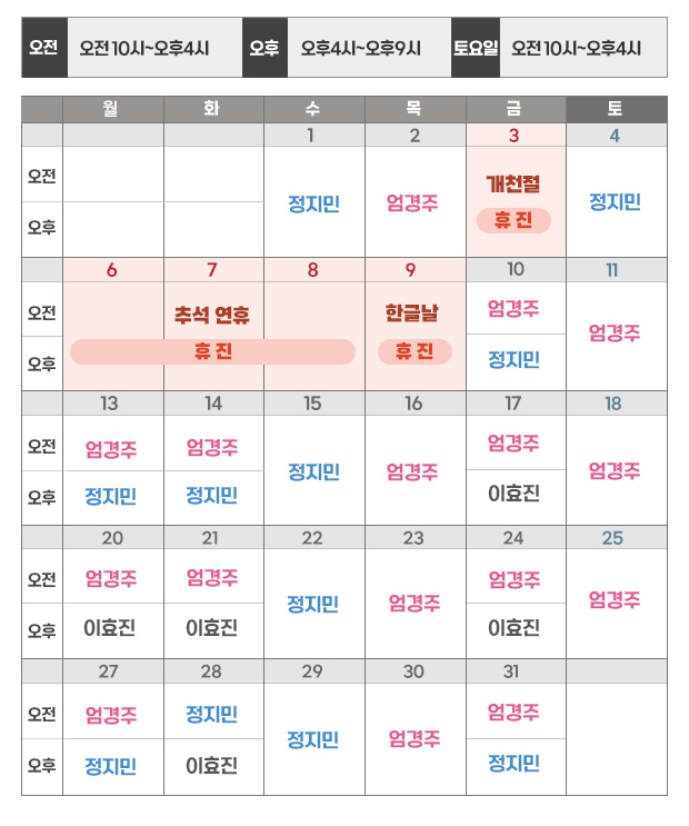 월/화/금 : 오전10시~오후8시 수/목 : 오전10시~오후5시 토요일 : 오전10시~오후5시 일요일 : 휴진 공휴일 : 오전9시~오후1시