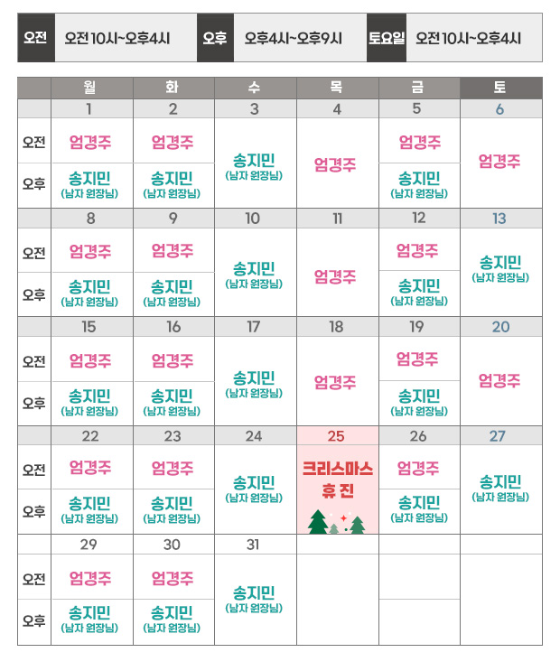 평 일 : 오전10시~오후7시 토요일 : 오전10시~오후5시 목요일/일요일 : 휴진 점심: 오후1:30~오후2:30 공휴일 : 오전9시~오후1시