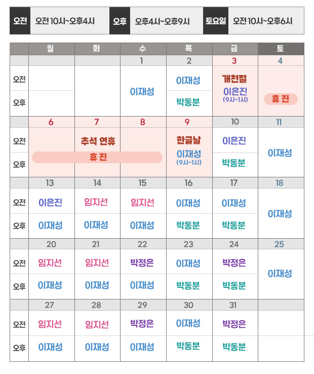 평 일 : 오전10시~오후9시 토요일 : 오전10시~오후6시 일요일 : 휴진 공휴일 : 오전9시~오후1시
